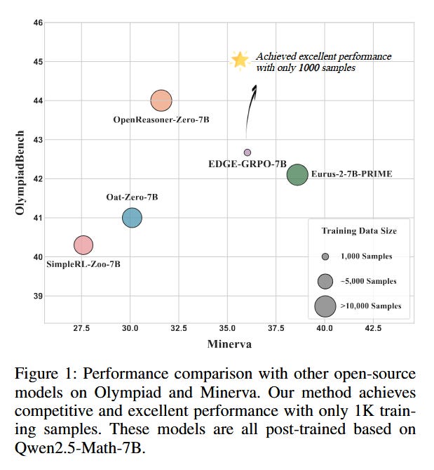 How does it solve the problem? EDGE-GRPO introduces two key innovations to keep training signals rich: Entropy-Driven Advantage and Guided Error Correction (hence the acronym EDGE). The entropy-driven advantage means the algorithm uses the model’s own confidence (entropy of its output distribution) as part of the advantage computation. Intuitively, if the model is very unsure (high entropy) versus very confident (low entropy) about an answer, EDGE-GRPO will treat those cases differently even if both got the same final reward. This helps avoid the case where all bad answers look equally bad – a hesitant wrong answer might be penalized differently than a confidently wrong answer, encouraging the model to learn to be confidently correct. The guided error correction component involves providing targeted feedback or updates for wrong answers specifically. While the paper’s details are technical, the concept is that the training process actively corrects errors by nudging the model in the direction of known-good reasoning steps (possibly through an auxiliary reward for making certain improvements or via human-provided hints integrated into the reward). Together, these mechanisms ensure that even within a group of responses that all fail, there is gradient diversity – some responses get a bit more advantage than others based on their entropy or partial progress, and the model receives guidance on how to fix its mistakes beyond just “try again.”