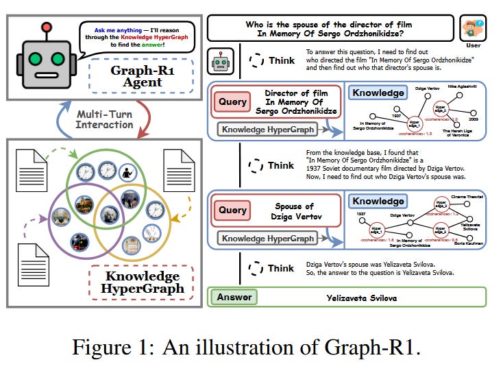 How does it solve the problem? Graph-R1 transforms the retrieval process into an interactive environment and trains a reinforcement learning agent to operate within it. Instead of retrieving text chunks once, the system constructs a lightweight knowledge hypergraph of the information – a structure of entities and their relations that is cheaper to build and rich in semantics. The Graph-R1 agent then models retrieval as a multi-turn agent-environment interaction: it treats the knowledge base like a world to navigate, where each action might be following a link or querying a related concept. The agent is optimized end-to-end via a reward mechanism that aligns with finding the correct answer. This means the agent learns policies for retrieval – when to stick with the current topic, when to pivot to a related entity, when to stop gathering information – all through trial and error guided by whether it leads to better answers. Crucially, by using RL, Graph-R1 doesn’t require manual prompt strategies for multi-hop queries; the agent organically figures out a strategy to fetch what it needs. The authors also introduce tricks for lightweight hypergraph construction, so that the agent isn’t burdened by an enormous graph: it likely builds or expands the graph on the fly as needed, keeping retrieval targeted. Overall, Graph-R1 is an agentic GraphRAG: a graph-guided retrieval system where an RL-trained agent actively and intelligently controls the retrieval process, bridging structured knowledge with the language model’s reasoning in an integrated loop.