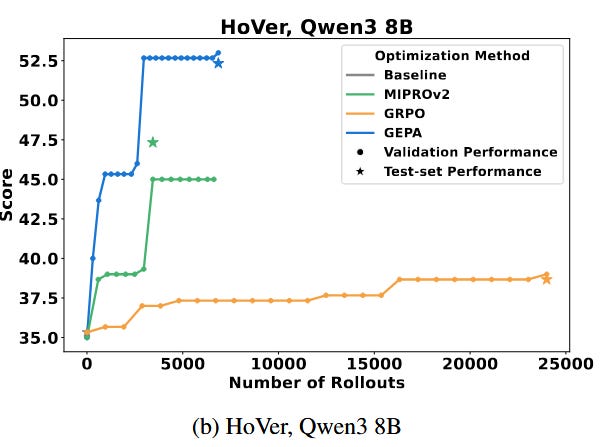 What are the key findings? GEPA dramatically outperforms traditional RL fine-tuning in both effectiveness and efficiency. Across four different tasks, it achieved on average a 10% higher success rate than a strong RL baseline (GRPO), and in some cases up to 20% higher. Crucially, it did so using far fewer trials – up to 35× fewer rollouts – meaning it squeezed much more learning out of each attempt. It also beat the previous state-of-the-art prompt optimization method (MIPRO v2) by over 10% on shared benchmarks. Qualitatively, the prompts evolved by GEPA were found to encode high-level “rules” and insights (often expressed in plain English) that helped the model avoid specific pitfalls. For example, on a coding task, GEPA might add a reminder like “first check for edge cases such as null inputs,” which an RL reward alone would never explicitly give. Another interesting finding is that GEPA’s approach can serve as an online strategy: the authors demonstrated it improving a model’s outputs on the fly during inference, by iteratively refining the prompt for each new problem. This blurs the line between training and usage – the model is essentially self-improving in real time by rewriting its own instructions.