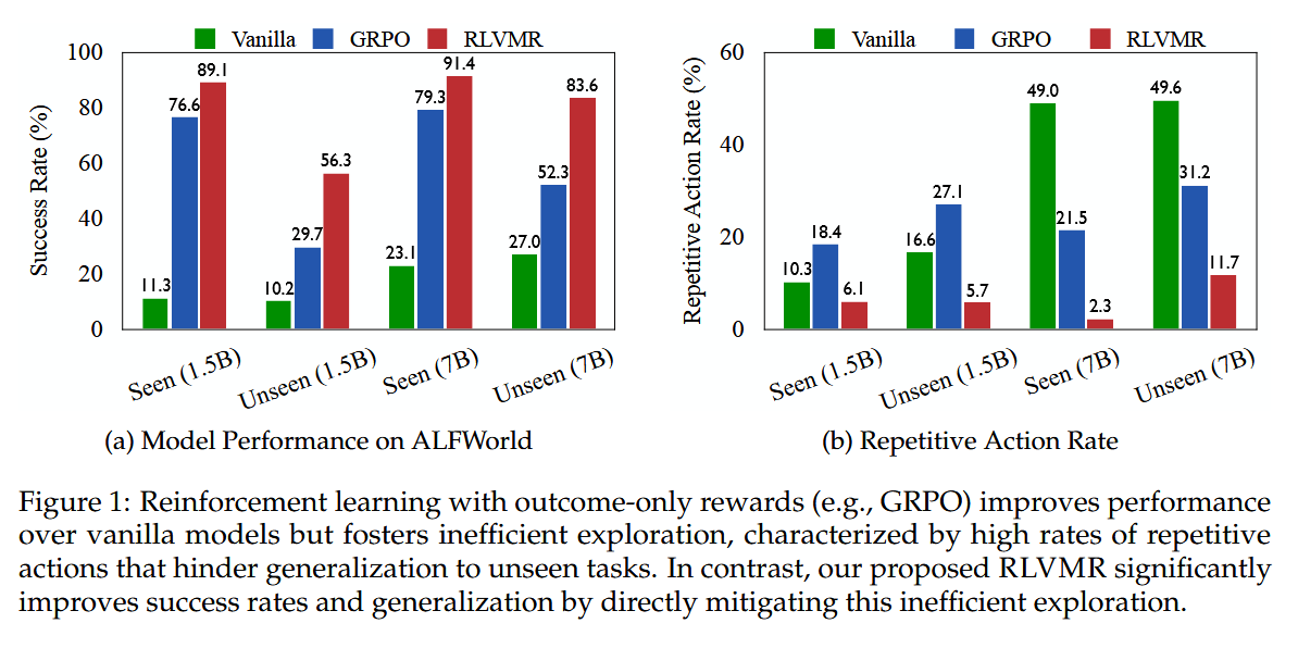 What are the key findings? Agents trained with RLVMR become significantly more robust and effective in long-horizon environments. On challenging interactive benchmarks like ALFWorld and ScienceWorld, RLVMR set new state-of-the-art performance – for example, a 7B-parameter LLM agent achieved an 83.6% success rate on the hardest unseen task split in ALFWorld, whereas previous approaches were much lower. These tasks involve multiple steps and require carrying out procedures in a simulated world, so that high success rate indicates the agent can reliably handle long tasks it hasn’t explicitly seen before. More illuminating, the agents’ behavior changed qualitatively: reasoning quality improved dramatically. They exhibited far fewer redundant or pointless actions – meaning the agent wasn’t just flailing around to accidentally solve the task, but was following more efficient, logical sequences. When mistakes happened, RLVMR agents showed enhanced error recovery: instead of getting stuck or repeating the same failed action, they would try a different strategy or backtrack appropriately (just as a human problem-solver might do upon realizing an approach isn’t working). Another benefit was interpretability: because the agent tags its cognitive steps and is rewarded for doing so clearly, one can literally see the agent “thinking” in a structured way. The researchers could verify that the performance gains indeed stemmed from better reasoning – for instance, the agent’s reflections often identified exactly why a previous attempt failed and how to fix it, demonstrating a depth of understanding that a pure outcome-based RL agent lacked. All of this suggests that the dense rewards successfully shaped not just what the agent does, but how it does it, leading to solutions that are both correct and grounded in sound reasoning. The combination of process and outcome rewards meant the agent didn’t sacrifice success for the sake of following rules – it actually achieved higher success because following those reasoning “rules” led to more robust strategies.