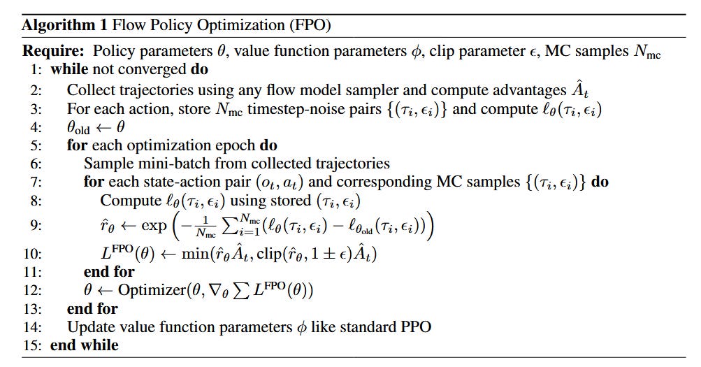 How does it solve the problem? The authors propose Flow Policy Optimization (FPO), an on-policy RL algorithm that marries diffusion-like flow modeling with standard policy gradients. In essence, they recast the policy learning objective as a flow matching problem: instead of directly maximizing expected reward, FPO trains the policy by matching the “probability flow” of an optimal policy. Concretely, they derive an update rule that maximizes the advantage-weighted geometric mean of probabilities (rather than arithmetic mean), aligning with a conditional flow matching loss. This approach slots neatly into the popular PPO (Proximal Policy Optimization) framework – they even use a PPO-style clipping mechanism to keep updates stable. The key innovation is that FPO doesn’t require computing exact likelihoods for diffusion model outputs at every step (bypassing a major hurdle). It also treats the choice of diffusion sampler as a plug-and-play detail, meaning the training isn’t handcuffed to any particular way of generating samples. The authors implement FPO and train diffusion-based policies from scratch on classic continuous control tasks (like locomotion and manipulation), effectively turning those tasks into a playground for generative models to act as agents.
