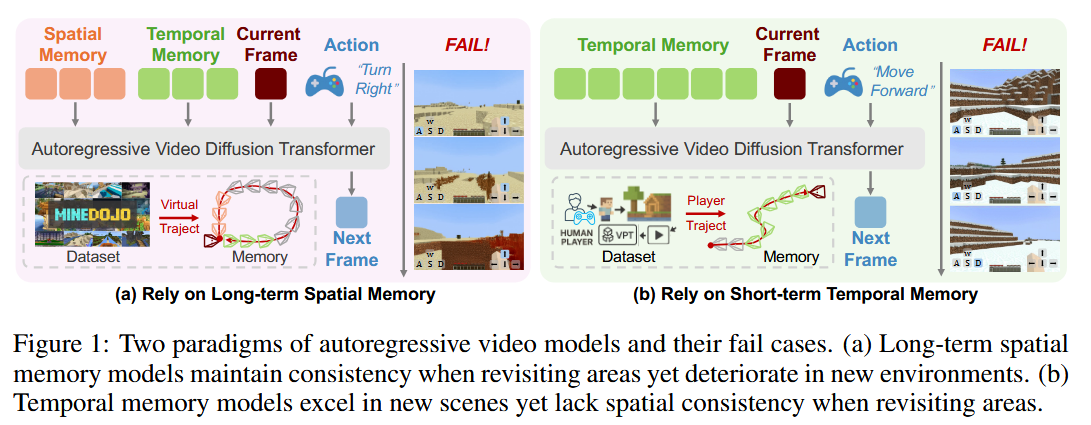 Problem: Autoregressive video models (like diffusion models) can simulate open-world gameplay (e.g. Minecraft), but face a trade-off in long-term consistency. They must generate novel content when exploring new areas, yet preserve details when returning to previously seen areas. With a finite context window, relying only on recent temporal memory means the model forgets older locations (losing spatial consistency). Conversely, incorporating a spatial memory (maps of past areas) can improve consistency but might harm creativity if the model clings to incomplete past info.