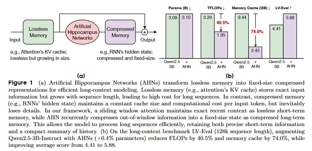 Artificial Hippocampus Network (AHN): A learnable “long-term memory” that compresses old tokens into a compact state while keeping the recent KV-cache intact - like archiving yesterday’s notes so today’s tab stays snappy.