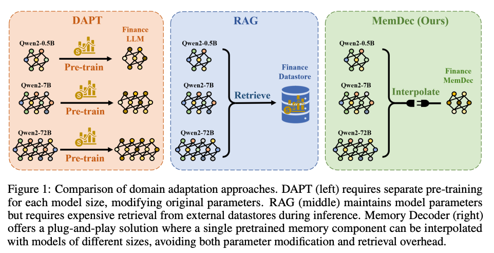 How does it solve the problem? Memory Decoder is a small (0.5B-1B) model that learns to mimic retrieval behavior through specialized pretraining. During inference, it runs in parallel with the main LLM, with outputs interpolated together. One Memory Decoder works with any model sharing the same tokenizer - true plug-and-play domain adaptation.