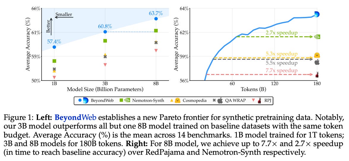 What are the key findings? Models trained on BeyondWeb reach the same performance 7.7x faster than those trained on raw web data. An 8B model trained on this synthetic data outperforms baselines by 7.1 percentage points across 14 benchmarks. Most surprisingly, a 3B model trained on BeyondWeb beats 8B models trained on other synthetic datasets.