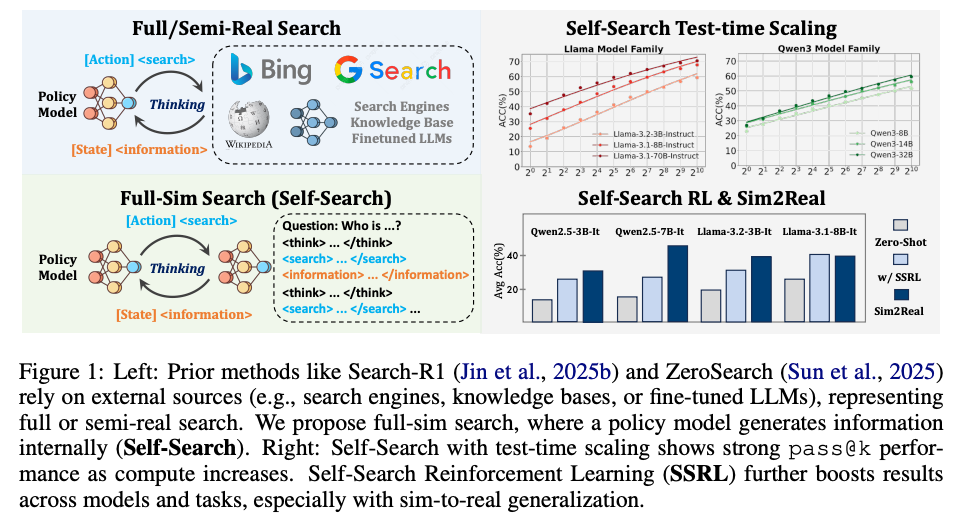 What are the key findings? Training is 5.53x faster than methods using external search. Models show strong scaling with inference budget and seamlessly integrate with real search engines after training. On challenging benchmarks like BrowseComp, SSRL-trained models match or exceed those trained with expensive external search.
