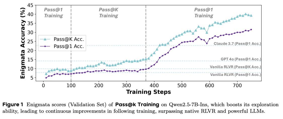 What are the key findings? A 7B model trained with Pass@k surpasses GPT-4o and Claude-3.7 on reasoning benchmarks. The method prevents the typical entropy collapse seen in RL training, maintaining diverse solution strategies. Performance improvements generalize to out-of-domain tasks, suggesting genuine capability enhancement rather than overfitting.