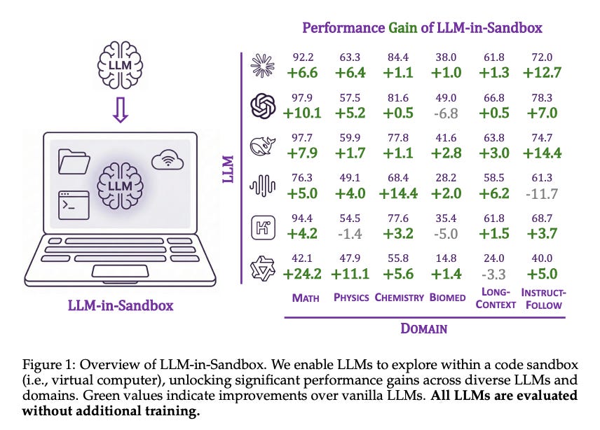 Approach: Enter LLM-in-Sandbox, a framework that places an LLM agent inside a virtual machine sandbox with a full suite of tools. The agent can issue commands to browse files, run scripts, call external APIs, etc., as if it were a human programmer operating a computer. Notably, the authors first show that strong LLMs can figure out how to use the sandbox tools without any additional training. Simply by prompting, models like GPT-3.5 or Claude instinctively perform actions like searching for information online, writing to disk to manage long texts, or executing code to do math or reformat output. Building on this, the paper introduces LLM-in-Sandbox-RL, a reinforcement learning approach that fine-tunes the model within the sandbox to use these tools even more effectively. Uniquely, this RL training doesn’t require handcrafted agent-specific data -they use general text tasks but allow the model to practice utilizing the sandbox, thereby marrying broad knowledge with tool-use skills.