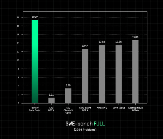 How does it solve the problem? Factory's way of building Droids (=Agents) involves an interdisciplinary approach that draws from research on human and machine decision-making, complex problem-solving, and learning from environments. The Code Droid, in particular, has demonstrated state-of-the-art performance on SWE-bench, a benchmark for evaluating software engineering capabilities. It achieved 19.27% on the full SWE-bench and 31.67% on the lite version, indicating its ability to handle a wide range of software engineering tasks efficiently.