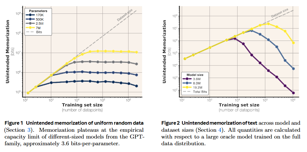 Why does it matter? These results provide the first principled measurement of language model capacity and offer a unified explanation for several puzzling phenomena in deep learning. The 3.6 bits-per-parameter finding gives us a concrete limit on how much information models can store, crucial for understanding privacy risks and designing training datasets. The connection between capacity, memorization, and double descent provides theoretical grounding for empirical observations that have long puzzled researchers. Perhaps most practically, the scaling laws for membership inference suggest that current large-scale training practices naturally provide some privacy protection simply through scale - a finding with significant implications for both model developers concerned about data leakage and researchers studying model behavior.