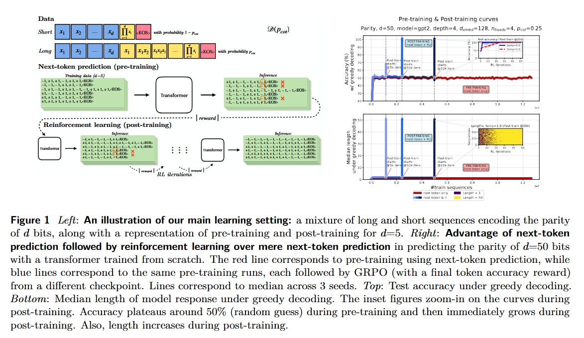 Why RL Helps LLMs Reason (paper): Tsilivis et al. tackle the question of how RL fine-tuning (after next-token pre-training) boosts reasoning. They introduce a theoretical framework showing that after pre-training, applying RL enables models to solve tasks requiring long chain-of-thought with far less data than next-token prediction alone. Essentially, RL rewards the final outcome of a multi-step reasoning chain, letting the model leverage longer test-time computation (longer answers) to learn the task. For example, in a toy parity task with mostly short examples, an RL-finetuned transformer generalizes correctly using long chains, whereas a purely next-token-trained one would need exponentially more data. They also confirm the effect on real models: RL finetuning LLaMA on mixture-of-experts math problems yields better generalization by exploiting longer reasoning steps.