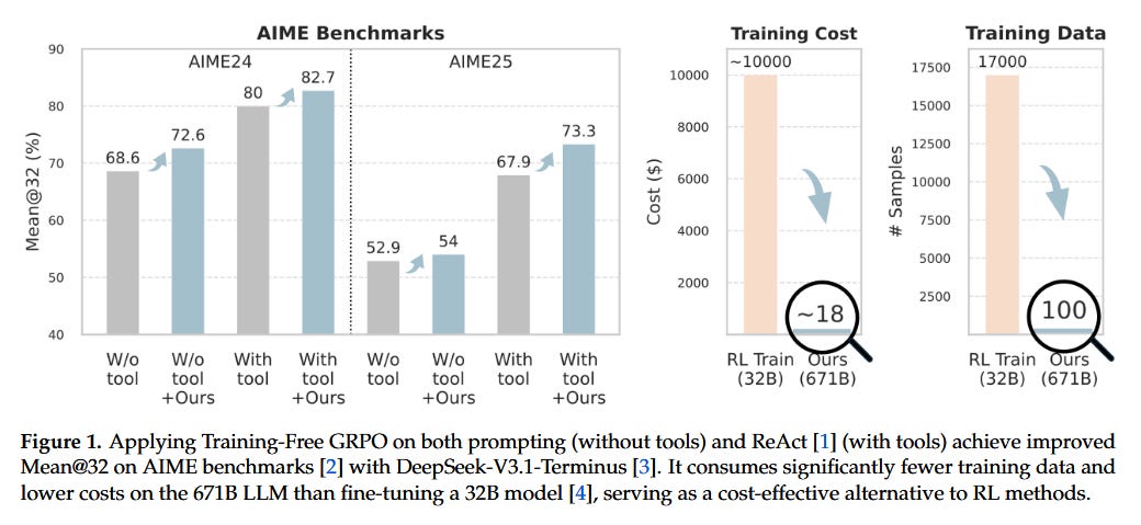Training-Free RL via Token Priors (paper): Reinforcement learning usually means updating model weights - but Cai et al. show you can get policy improvements without any finetune. Their “Training-Free Group RPO” method treats the base LLM as fixed and instead adjusts the output token distribution on the fly using experience. During deployment, the agent generates multiple rollouts; within each group of rollouts, the method computes a “group relative semantic advantage” for tokens (think: which tokens led to better outcomes) and distills this into a token-level prior to bias the model’s next decisions. By iterating this process over a few epochs (with only a handful of ground-truth examples as reference), the LLM acquires “experiential knowledge” that steers its outputs, all without gradient updates. In tasks like math reasoning and web search, adding this lightweight loop to a state-of-the-art agent (DeepSeek) significantly improved out-of-domain performance. In fact, with only a few dozen examples, the training-free approach outperformed fully finetuned smaller LLMs - at a fraction of the cost and time, since it avoids any traditional RL training phase.
