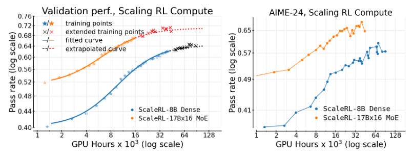 Predictable Scaling of RL Compute (paper): A Meta & collaborators study provides the first large-scale analysis (400k GPU-hours!) of how RL fine-tuning scales for LLMs. They fit sigmoidal compute-performance curves and find that many design choices (loss aggregation, normalization, etc.) mainly affect compute efficiency but not final performance. With these insights, they introduce a best-practice recipe “ScaleRL” that extrapolates small-run learning curves to predict final performance. Using ScaleRL, they successfully forecast a 100k GPU-hour run’s result, moving RL training closer to the predictability of pre-training.