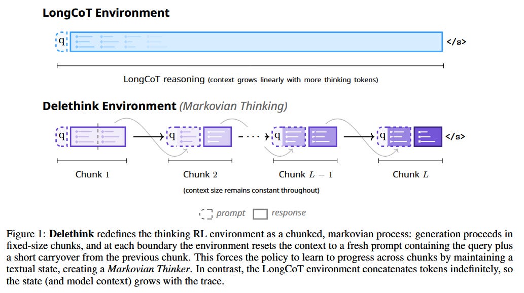 “Markovian Thinker” for Long Reasoning (paper): Long chain-of-thought reasoning typically forces an LLM agent to condition on an ever-growing prompt (making RL policies pay quadratic cost as thoughts get longer). Aghajohari et al. propose Markovian Thinking, reformulating the RL “thinking environment” so the model only ever sees a fixed-size state. In their Delethink setup, reasoning is chunked into segments: the model generates a brief state summary at each chunk’s end, then resets context and continues fresh with that summary. This yields linear-time, constant-memory scaling. A 1.5B model trained with Delethink can reason for 24k tokens in 8k-token chunks, matching or beating a baseline trained with full 24k-token context. Even more impressively, it continues to improve with longer reasoning (96k tokens), while the baseline plateaus - at roughly one-quarter of the computing cost (estimated 7 H100-months vs 27 for the baseline). Redesigning the environment, not just the model, thus enables efficient, scalable long-term reasoning.