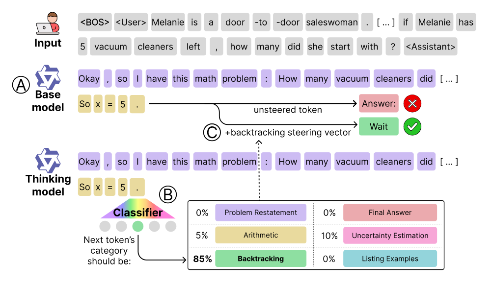 “Base” vs “Thinking” Models - Knowing How vs When (paper): Are chain-of-thought “thinking” models fundamentally more capable, or just better at using base model skills? Venhoff et al. find it’s largely the latter. By injecting small steering vectors into a frozen base model’s activations at just ~12% of positions, they can trigger the model’s latent reasoning abilities and recover ~91% of the performance gap up to a full chain-of-thought trained model - all with no weight updates. This implies large pre-trained LLMs already “know how” to reason, and what specialized finetuning really does is teach them when to deploy those skills. In other words, pre-training equips the model with reasoning mechanisms, and post-training (“thinking” model training) mainly teaches efficient use of those mechanisms at the right time. This insight reframes how we view advanced reasoning LLMs: much of the reasoning prowess was latent in the base model all along.