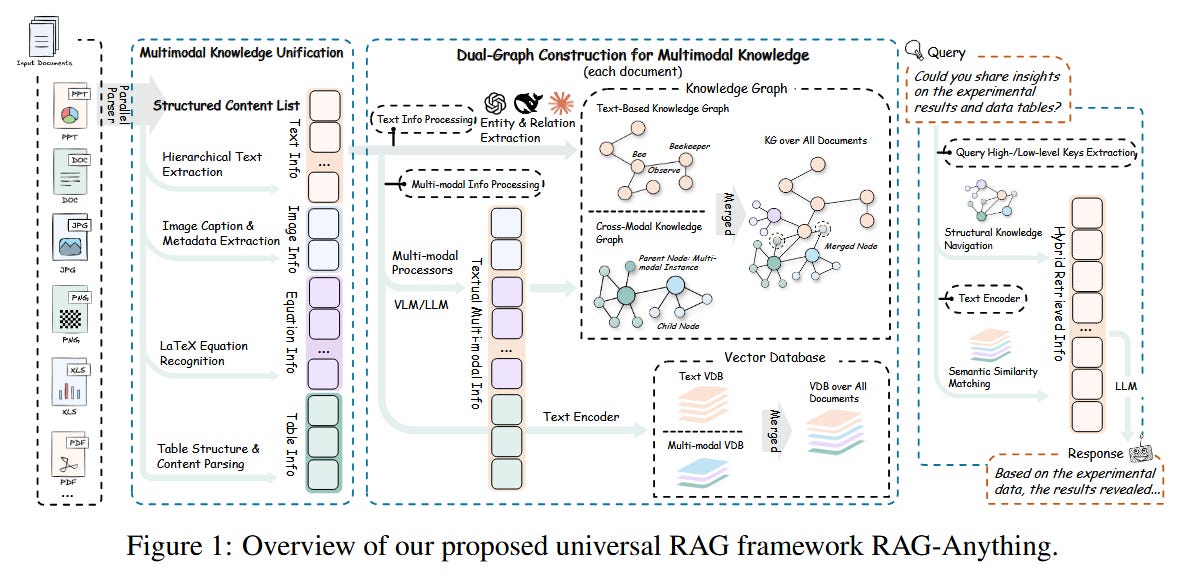RAG-Anything: All-in-One RAG Framework (Guo et al., 2025) - Extending retrieval-augmented LLMs beyond text. Retrieval-Augmented Generation (RAG) typically allows an LLM to fetch textual documents to overcome knowledge cutoff. However, knowledge in the real world is multimodal - images, tables, charts, math equations - and current RAG systems handle primarily text, missing a lot. This work presents RAG-Anything, a framework enabling LLMs to retrieve and reason over any modality. The key idea is to represent multimodal content (text, visuals, audio, etc.) as interconnected knowledge graphs rather than separate data silos. RAG-Anything builds a dual-graph representation of a knowledge base: one graph captures cross-modal relationships (e.g. an image and its caption or a table and its description), while another captures textual semantic similarity. It then performs a cross-modal hybrid retrieval that combines structural navigation (following links/relationships in the graph) with semantic matching (embedding-based search). This allows the system to fetch evidence that spans multiple modalities in a coherent way. The authors report that RAG-Anything significantly outperforms text-only retrieval on challenging multimodal QA benchmarks. Gains are especially large for long documents that include mixtures of text and figures, where traditional RAG fails to gather the relevant pieces. By eliminating the modality-specific fragmentation in knowledge access, this unified approach lets LLMs use images, diagrams, tables, etc. as seamlessly as text. (The code is open-sourced, signaling a push toward truly multimodal chat assistants.)