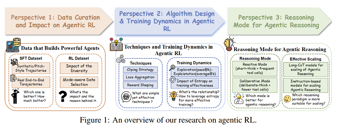 Demystifying Reinforcement Learning in Agentic Reasoning (Yu et al., 2025) - A comprehensive study dissects how to best fine-tune LLMs with RL for complex reasoning tasks. The authors investigate RL-enhanced “agentic” LLMs (models that use tools and multi-step reasoning) along three axes: the training data, the RL algorithm/hyperparameters, and the agent’s reasoning mode. Through extensive experiments, they identify several key practices for success: (i) Use high-quality, real interaction trajectories instead of stitched or simulated ones. Replacing synthetically stitched tool-use sequences with real end-to-end examples led to a much stronger starting model via supervised fine-tuning, and maintaining a diverse, model-aware dataset throughout RL greatly boosted performance. (ii) Apply exploration-friendly RL techniques. The study found that allowing the policy more freedom - e.g. using a higher clipping threshold on advantages, adding gentle reward shaping for long trajectories, and keeping some entropy (randomness) in the policy - is crucial for efficient training. These help the model explore solution paths rather than getting stuck. (iii) Optimize the agent’s reasoning style: A surprising insight is that less can be more - an agent that plans with fewer, more targeted tool calls and avoids overly verbose chain-of-thought actually achieves higher accuracy and tool efficiency. In other words, deliberative reasoning beats constant tool use or endless self-talk in these benchmarks. Implementing these practices, the authors show that even a 4B-parameter model can outperform a 32B model on complex agent benchmarks when using their improved RL recipe. They also release a high-quality dataset (with real tool-usage traces and an RL fine-tuning set) to serve as a strong baseline for future research. All together, this work provides a much-needed empirical guidebook for RLHF-style training of reasoning agents, pinpointing what actually moves the needle in making LLMs more effective decision-makers.