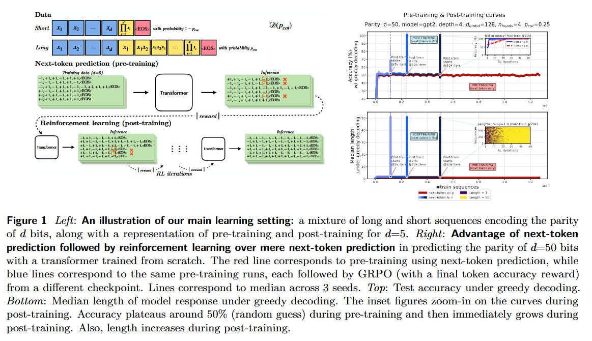 How Reinforcement Learning After Next-Token Prediction Facilitates Learning (Tsilivis et al., 2025) - A deep dive into the mechanics of fine-tuning LLMs with RL on reasoning tasks. Recent breakthroughs in mathematical and logical reasoning by LLMs have relied on a recipe: first pre-train on next-token prediction, then fine-tune with RL (e.g. optimizing a reward for correct answers). This paper asks why the RL stage is so effective. The authors develop a theoretical framework using a toy parity bit task and prove that RL fine-tuning enables generalization that next-token training alone cannot achieve without exponentially more data or compute. The intuition is that an RL objective can leverage longer chain-of-thoughts at test time - effectively letting the model use additional computation (by generating longer explanations/steps) to solve a task. In their setup, the training data is a mixture of short and long reasoning sequences (e.g. mostly short explanations with a few long detailed ones). They show mathematically that an autoregressive model trained only by imitation (next-token) struggles to learn the rare long dependencies. But if you then apply RL that rewards correct final answers, the model learns to use the occasional long chain-of-thought to get those answers right, even when such long examples were sparse in the data. Essentially, RL fine-tuning teaches the model when to deploy a long reasoning chain. The authors prove, in a simplified linear model, that as long as a non-negligible fraction of long trajectories exist, this two-stage training efficiently learns the underlying task, whereas next-token learning would need an impractical amount of long examples. They confirm these phenomena on real LLMs (LLaMA models) on math reasoning benchmarks: models with an RL second stage solve problems with far greater depth than those without. This work provides a theoretical backbone for why techniques like Reinforcement Learning from Human Feedback (RLHF) dramatically improve reasoning: the RL step is not just fine-tuning - it’s fundamentally expanding the model’s ability to utilize longer, more strategic reasoning that was latent after pre-training.
