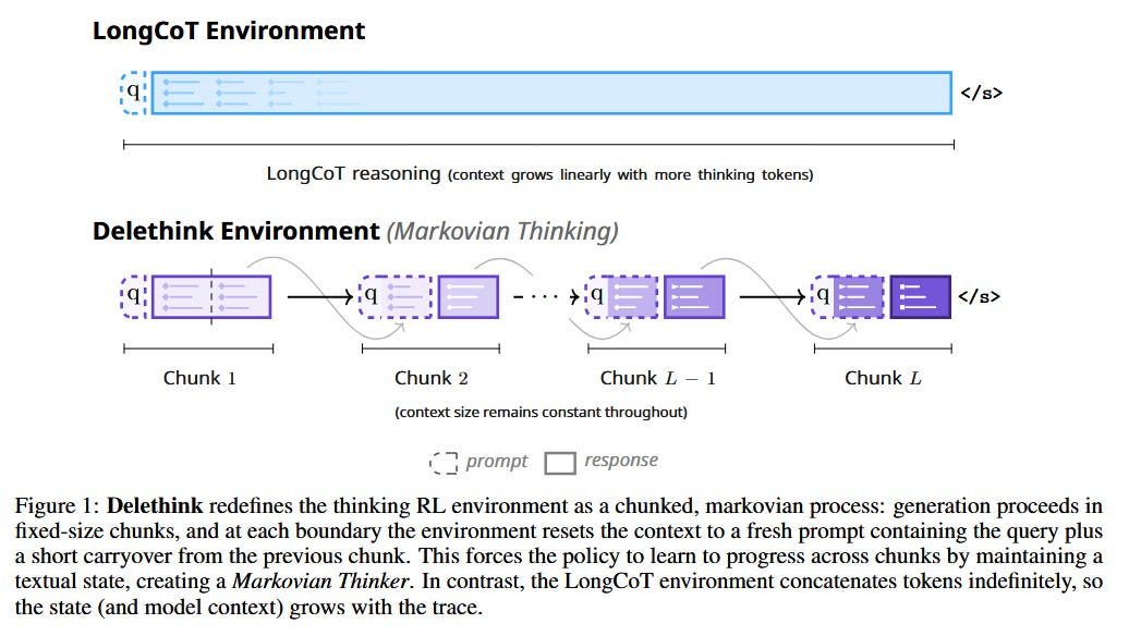 The Markovian Thinker (Aghajohari et al., 2025) - A new paradigm to train LLMs for really long reasoning without blowing up compute. When we use reinforcement learning to teach an LLM to do multi-step reasoning (e.g. solve a lengthy math proof with a series of steps), the naive approach treats the entire prompt plus all generated tokens as the state for the next token decision. This “LongCoT” setup means the state length keeps growing, leading to quadratic time/cost as the chain-of-thought grows. This paper proposes Markovian Thinking, which redefines the environment so that the model only ever conditions on a fixed-length context, regardless of how long the overall solution is. The trick is to chunk the reasoning process into segments. After a segment (say 256 tokens) is generated, the environment “resets” - it provides the model a brief summary of what’s been done (a short carryover state) and then the model continues the reasoning in a fresh context window. Essentially, the model learns to write a concise state representation at the end of each chunk that will allow it to seamlessly pick up after the reset. They implement this in an RL environment called Delethink (think “delete the context, keep the essential”) with 8K-token chunks. A 1.5B model trained in this setup was able to generate coherent reasoning traces up to 24K tokens long in 8K contexts, matching or slightly surpassing the performance of a baseline that was trained with the full 24K context window. Because of the fixed state, the compute cost grows linearly with the reasoning length instead of quadratically. The authors extrapolate that extending reasoning to 96K tokens would take ~4× less GPU time with Markovian (7 H100-months) compared to standard LongCoT RL (27 H100-months). They also found that many existing LLMs (from 1.5B to 120B) already sometimes output “Markovian” chain-of-thoughts (i.e., they naturally segment their reasoning) without any fine-tuning. This means the model can be seeded with zero-shot examples of the desired behavior, making RL training stable. Bottom line: by changing the rules of the game (the MDP for reasoning), we can train LLMs to solve very long-horizon tasks with constant memory and manageable computation - a promising step toward scalable “System 2” reasoning in AI.