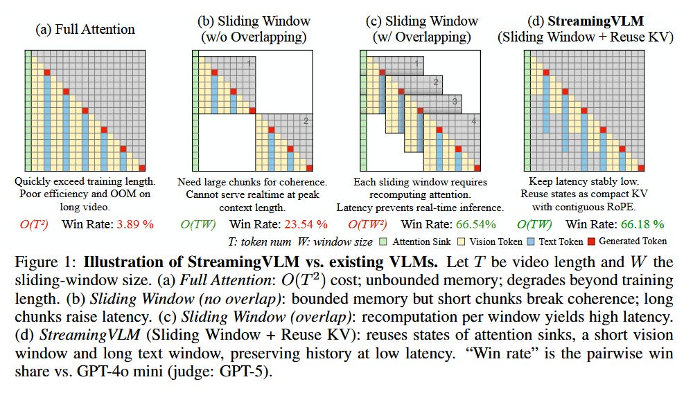 StreamingVLM: Real-Time Understanding for Infinite Video Streams (Xu et al., 2025) - An architecture to turn video+language models into live video interpreters. As AI moves into assisting with eg. wearable cameras or robot perception, a challenge emerges: processing an unending video stream without infinite memory or latency. Traditional vision-language models struggle with long videos because either you use full attention (quadratic cost - impossible beyond a few minutes), or a sliding window (which can break temporal coherence or incur redundant computations). StreamingVLM introduces a unified framework that aligns how the model is trained with how it will inference on streaming data. The model is trained via supervised fine-tuning on short overlapping video chunks, but with a twist: at inference it maintains a compact memory of past context by reusing certain states rather than naively recomputing or forgetting. Specifically, it keeps a fixed-size key-value cache composed of three parts: (a) “attention sinks” - a set of latent states that aggregate long-term info, (b) a short window of recent visual frames (so it always looks at the latest few moments in full detail), and (c) a longer window of recent text (so it remembers the dialogue or instructions). By resetting context smartly and carrying over only distilled state, the model’s computation stays bounded even as the video stream goes on indefinitely. The authors create a new benchmark with 2-hour continuous videos requiring second-by-second captioning/alignment. StreamingVLM achieves real-time performance (8 frames/sec on one GPU) while maintaining coherent understanding across the entire 2+ hour video. It beats a strong baseline (GPT-4O mini) in head-to-head comparisons 66% of the time. Impressively, the streaming training strategy also made the model better at general video QA - it boosted performance on standard long-video QA benchmarks by 4-6 points without any direct fine-tune on those tasks. This work paves the way for LLM-powered assistants that can watch and narrate live video nonstop, by combining sliding windows with learned memory in a principled, efficient manner.