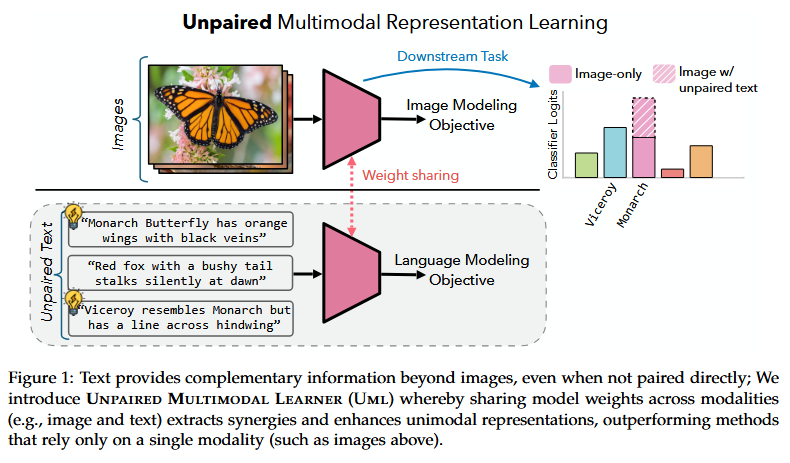 Better Together: Leveraging Unpaired Multimodal Data for Stronger Unimodal Models (Gupta et al., 2025) - Can a vision model get better by training alongside text, even if no image is directly paired with any text? This paper answers yes, introducing UML (Unpaired Multimodal Learner), a training paradigm where a single model processes different modalities in turn without one-to-one alignment. The premise is that different data modalities (images, text, audio) are all projections of the same underlying reality - so even if you don’t have matched pairs, a model sharing parameters across modalities can learn general features that help each other. In UML, an iteration might feed an image through the network, then on the next batch feed text through the same network (with modality-specific input encoders), and so on, updating shared weights throughout. The authors prove under a linear Gaussian model that using an auxiliary modality will strictly increase the Fisher information about the target task, effectively reducing variance of the learned representation. In intuitive terms, even unpaired data from a second modality provides “another view” of the world that can sharpen the model’s understanding of the primary modality. One striking theoretical result: in some cases a single sample from an auxiliary modality can contribute as much as an entire additional sample of the primary modality in terms of information gain. Empirically, UML is validated on a wide range of benchmarks. For example, training an image classifier jointly with unpaired text data yields higher accuracy than training on images alone - especially on fine-grained or few-shot tests. Models trained with UML also prove more robust to distribution shifts (e.g. an ImageNet model is sturdier against ImageNet-Sketch or -A variants if it was also trained with text). The benefits extend to three modalities: adding both text and audio to an image model yielded monotonic improvements. Notably, the researchers quantified a “exchange rate” between modalities: with certain pretrained encoders, they found 1 image ≈ 228 words in terms of contribution to accuracy, highlighting how aligned representations make modalities highly complementary. Overall, UML demonstrates a simple but powerful idea: you don’t need perfectly synced multimodal pairs to get multimodal benefits - just throw all the data into one model with a shared representation, and each modality will make the others stronger.