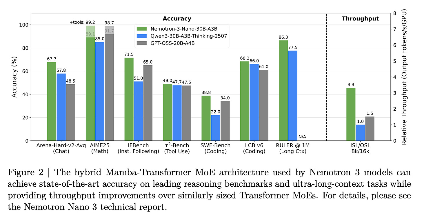 NVIDIA’s latest release, Nemotron 3, is a family of large language models built with a hybrid Mixture-of-Experts (MoE) Transformer architecture (“Mamba-Transformer”). These models deliver up to 3.3x higher inference throughput than typical Transformers and support an unprecedented 1 million tokens of context window. Despite the efficiency boosts, Nemotron 3 matches state-of-the-art accuracy on complex, agent-driven tasks. In the spirit of open science, NVIDIA has open-sourced the model weights, training code, recipes, and over 10 trillion tokens of training data, making this a significant push toward more accessible high-performance LLMs.
