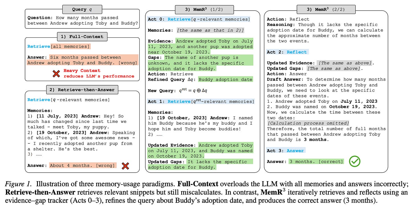 LLM-based agents augmented with a long-term memory often just retrieve some notes and answer, but this work makes memory use more deliberative. MemR³ (pronounced “MemR-cubed”) adds a decision-making controller that can choose to retrieve, reflect, or answer at each step, and an evidence-gap tracker that monitors what information is still missing. This closed-loop approach means the agent can iteratively pull in facts and verify them before finalizing an answer, instead of one-shot retrieval. In evaluations (LoCoMo benchmark), MemR³ outperformed standard retrieval-augmented baselines, boosting overall QA accuracy. For example, with a GPT-4.1-mini backend it improved a retrieval-augmented generation setup’s score by 7.3% (absolute). MemR³ acts like a “memory coach” for LLM agents, yielding better answers and offering a plug-and-play improvement to existing memory systems.