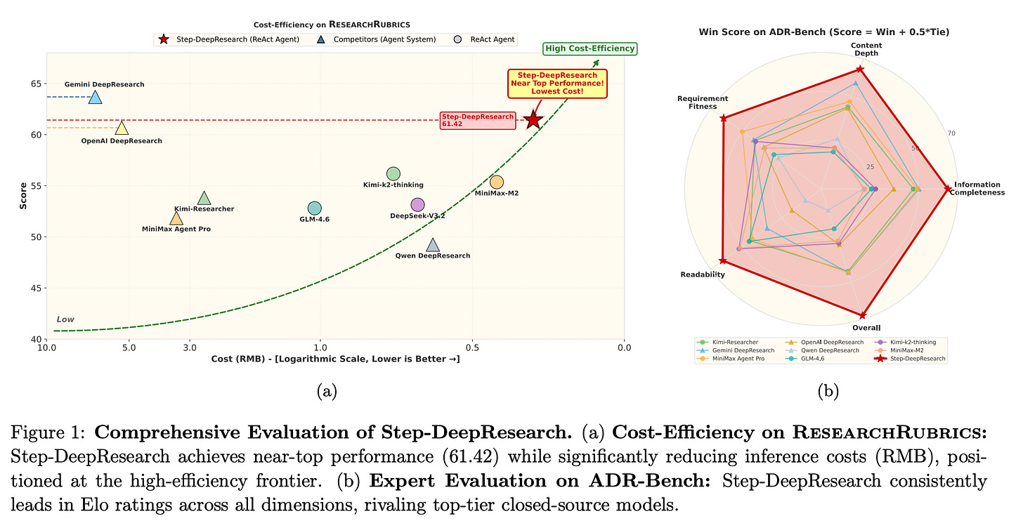 A team at StepFun presents Step-DeepResearch, an autonomous “Deep Research” agent designed to perform open-ended research tasks like a human expert. Built on a 32-billion-parameter LLM, it internalizes various research skills (planning, information seeking, cross-checking, report writing) instead of relying on external tools. Impressively, it scored 61.42 on the ResearchRubrics benchmark - second overall, edging out OpenAI’s DeepResearch system - while running at one-tenth the cost of other top models. The system also introduces a new ADR-Bench to evaluate complex real-world queries (including Chinese language tasks) for more comprehensive benchmarking.