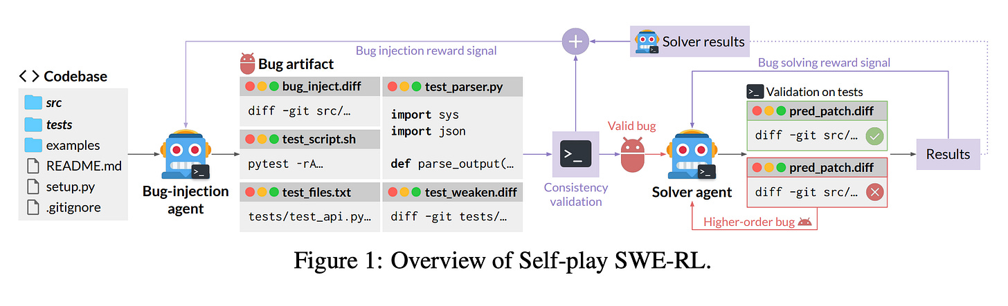 How can we train AI agents to write and debug code beyond human-provided examples? This paper proposes Self-play SWE-RL (SSR), a method where a single coding agent plays both the attacker and solver. In a sandboxed repo, the agent first introduces a bug into the code, then tries to fix it - iteratively generating harder challenges for itself. This self-play training required no human-written issues or tests. On two software engineering benchmarks (SWE-Bench), the SSR-trained agent showed substantial self-improvement, gaining +10.4 and +7.8 points and outperforming a baseline that used human data throughout trainingemergentmind.com. These early results hint at a path to autonomously improving software agents: an AI that gets better by continuously practicing on problems it creates for itself.