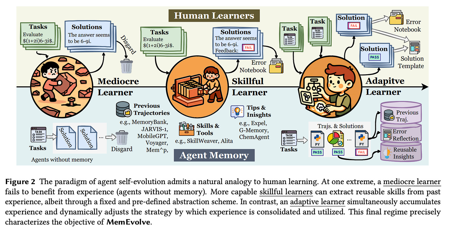 Researchers from OPPO and NUS introduce MemEvolve, a framework that lets AI agents learn to improve their own memory modules over time. The idea is a meta-evolutionary loop: the agent’s memory architecture (how it stores and recalls information) is itself continuously optimized as the agent solves tasks. In experiments, LLM-based agents using MemEvolve achieved up to +17% better task performance after refining their memory system. Even more, this improvement generalized across different tasks, base models, and agent frameworks. In short, giving agents the ability to evolve their memory makes them more adaptable and effective learners.