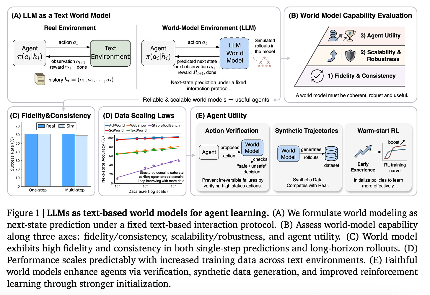This study (University of Edinburgh & Microsoft Research) asks if an LLM can serve as a world model - in other words, can it internally simulate how a textual environment changes in response to actions? The authors show that with supervised fine-tuning, LLMs can indeed make accurate next-state predictions and maintain long-horizon consistency in text-based simulations. These implicit world-model LLMs significantly improved the learning of AI agents: they can generate synthetic experiences for an agent to learn from, act as safe “what-if” simulators to test strategies, and help bootstrap reinforcement learning policies. This suggests a new role for LLMs as environment simulators that furnish agents with common sense and foresight without needing explicit physics or game engines.