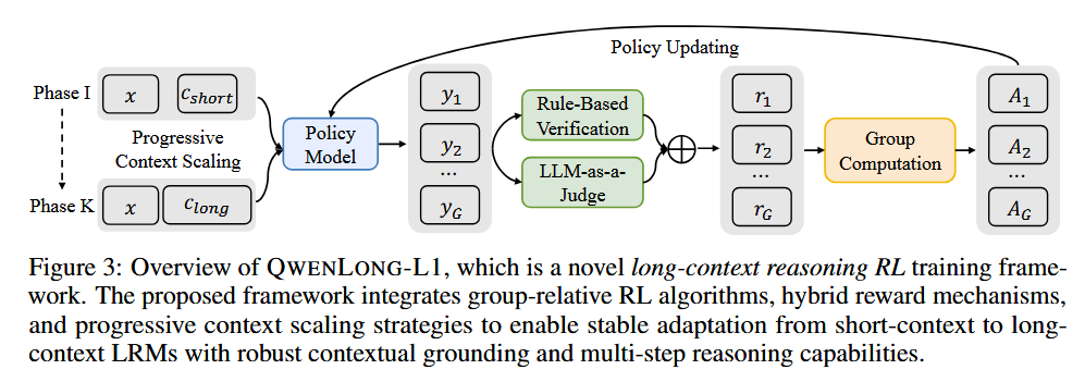 How does it solve the problem? QwenLong-L1 is a progressive context scaling framework that systematically adapts short-context reasoning models to long-context scenarios. Their approach includes three key components: first, a warm-up supervised fine-tuning (SFT) stage to establish a robust initial policy; second, a curriculum-guided phased RL technique that gradually increases context length across training phases to stabilize optimization; and third, a difficulty-aware retrospective sampling strategy that prioritizes challenging examples to encourage policy exploration. They also implemented hybrid reward mechanisms combining rule-based verification with LLM-as-a-judge evaluation to balance precision and recall.