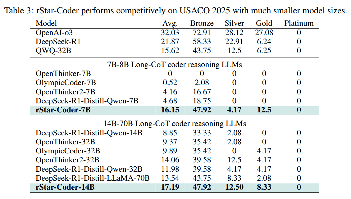 What are the key findings? rStar-Coder dramatically improved code reasoning capabilities, with the Qwen2.5-7B model jumping from 17.4% to 57.3% on LiveCodeBench, and the 14B version reaching 62.5%, actually beating OpenAI's o3-mini by 3.1%. On the notoriously difficult USA Computing Olympiad benchmark, their 7B model achieved 16.15% accuracy, outperforming the much larger QWQ-32B model - particularly impressive since QWQ-32B was the very model used to generate their training solutions. The approach also proved that quality trumps quantity: despite using fewer examples (580K) than competitors like OCR (736K) and OpenThinker2 (1M), rStar-Coder consistently outperformed them. Even more surprisingly, models trained on this competition-focused dataset generalized remarkably well to standard code generation tasks, with the 7B model matching Claude 3.5 Sonnet's performance on benchmarks like HumanEval.