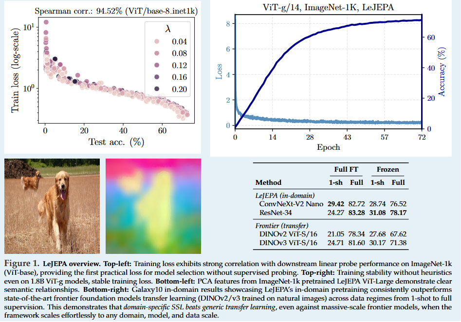 Strong performance: Despite its simplicity, LeJEPA delivers competitive results. The authors validate it on 10+ datasets and 60+ model architectures. For example, with ImageNet-1k pretraining and a ViT-H/14 backbone, LeJEPA reaches about 79% top-1 accuracy in a frozen-feature linear probe - on par with state-of-the-art self-supervised methods. The work demonstrates that a principled, theory-driven approach can match the performance of heuristic-heavy methods, potentially reestablishing self-supervised pretraining as a core pillar of AI research.