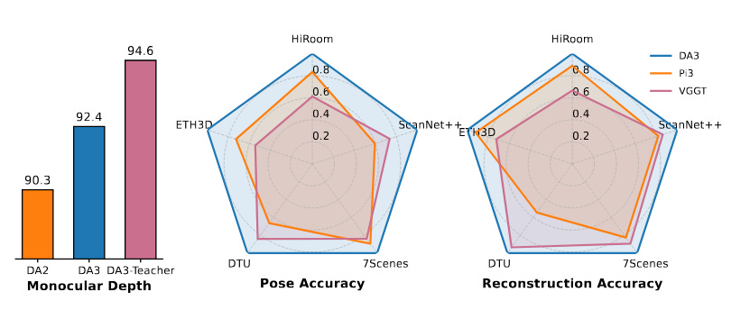 State-of-the-art performance: DA3 establishes a new visual geometry benchmark (covering camera pose estimation, any-view geometry, and rendering) and outperforms prior methods by a large margin. For example, it improves camera pose accuracy by ~44% and geometric accuracy by ~25% over the previous SOTA model (VGGT). It even surpasses DA2 on monocular depth estimation, setting new state-of-the-art results across all tasks.