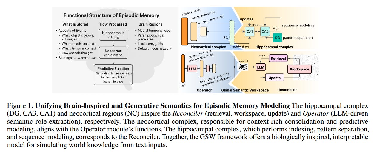 Structured generative memory: The GSW framework consists of two main components. An Operator module maps incoming text or observations into intermediate semantic structures (for example, converting a paragraph into a mini knowledge graph of the events and entities). A Reconciler module then integrates these structures into a persistent global workspace, enforcing temporal, spatial, and logical coherence as the narrative progresses. This persistent workspace serves as an interpretable memory that the LLM can query and update, much like a human’s episodic memory. It allows the model to reason about evolving roles, actions, and contexts rather than just static facts.