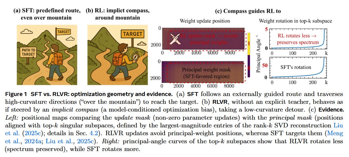 Distinct fine-tuning regime: Empirically, RLVR’s parameter updates produce minimal distortion of the model’s spectral properties - there is little drift in the major singular values, and the principal subspace orientation is largely preserved. In contrast, standard Supervised Fine-Tuning (SFT) tends to push weights along principal directions, significantly rotating the feature space and often degrading the pretrained spectral structure. RLVR even outperforms SFT in reasoning tasks, despite touching fewer weights. These results show that RL fine-tuning operates in a qualitatively different regime from SFT. Consequently, the authors caution that directly applying SFT-era fine-tuning techniques (e.g. LoRA or other parameter-efficient methods) to RL training can be misguided. The paper’s insights pave the way for designing new, geometry-aware fine-tuning methods tailored specifically to RLVR, rather than repurposing heuristics from the SFT paradigm.