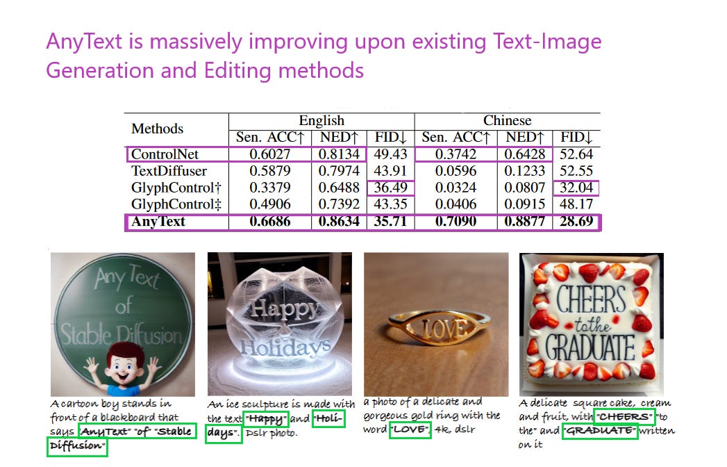 How does it solve the problem? AnyText addresses this issue through a novel diffusion pipeline that includes an auxiliary latent module and a text embedding module. The auxiliary latent module generates latent features for text generation or editing using inputs like text glyph, position, and masked image. The text embedding module, on the other hand, employs an OCR model to encode stroke data as embeddings, which are then blended with image caption embeddings from the tokenizer. This approach allows for the generation of texts that seamlessly integrate with the background in multiple languages. Training enhancements like text-control diffusion loss and text perceptual loss further bolster writing accuracy.